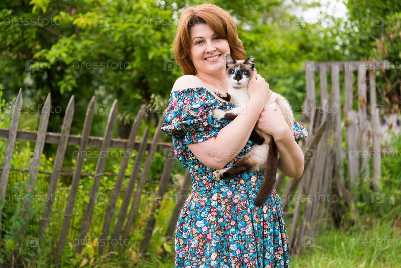 Женщина держит кошку на фоне сельского забора