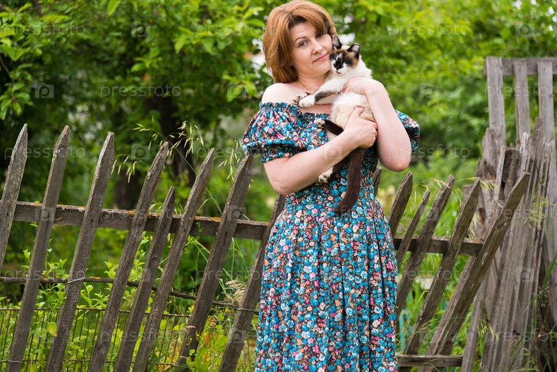 Женщина держит кошку на фоне сельского забора