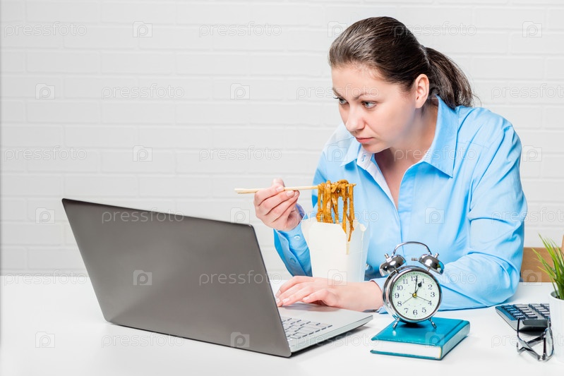 Женщина бухгалтер ест лапшу на обеденном перерыве