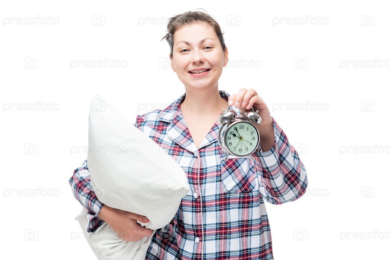 Счастливая женщина с подушкой в руке показывает позднее время на будильнике