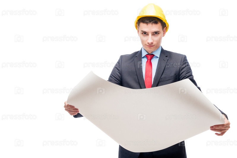 Портрет архитектора с большим листом бумаги с чертежами на белом фоне