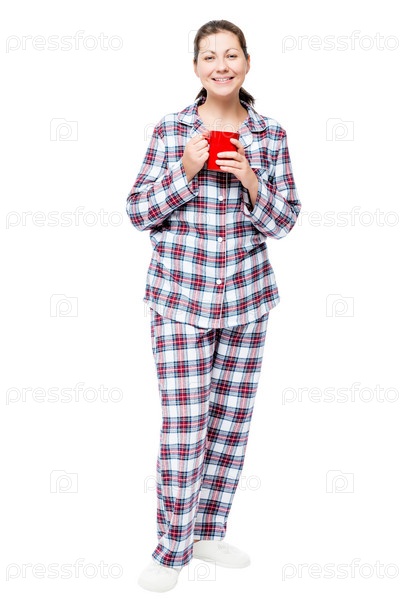 Веселая девушка в пижаме с кружкой кофе