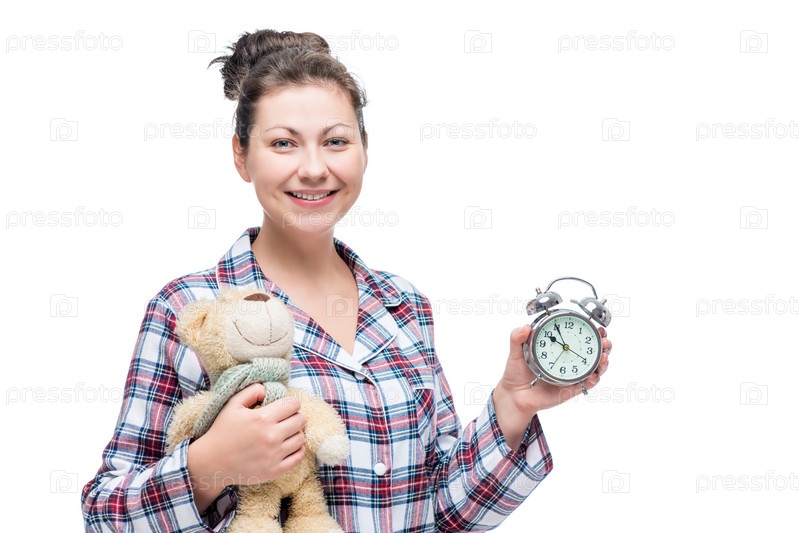 Красивая женщина в пижаме с плюшевым мишкой и будильником