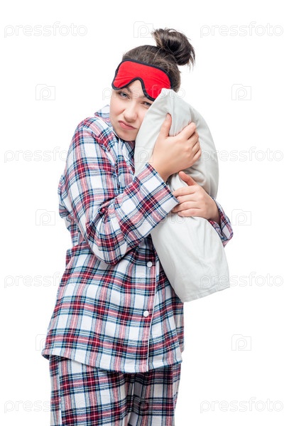Сонная женщина в пижаме, обнимая свою любимую подушку