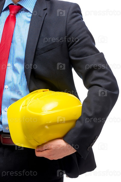 Защитная желтая каска в руках архитектора