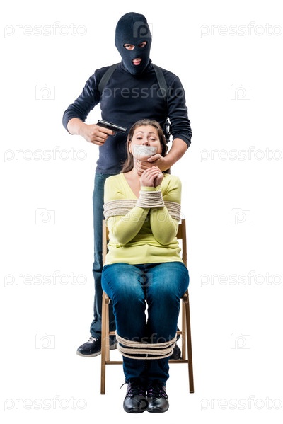 Террорист в маске с оружием и связанный заложник