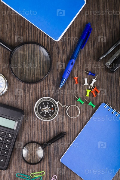 Блокнот, ручка, калькулятор и компас на столе