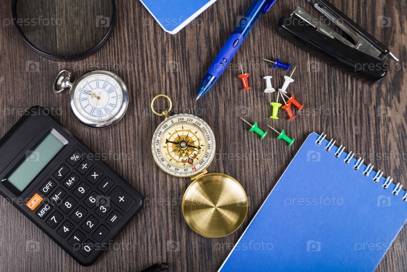 Блокнот, ручка, калькулятор и компас на столе
