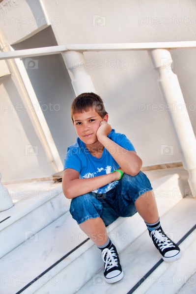 Мечтающий беззаботный мальчик сидит на крыльце