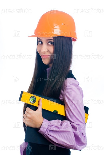 Молодая женщина-рабочий в защитной каске с уровнем, изолированная на белом фоне