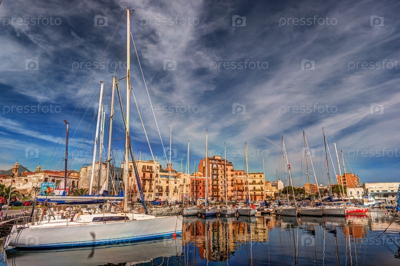 Лодки и яхты на стоянке в Ла Кала залива, старый порт в Палермо