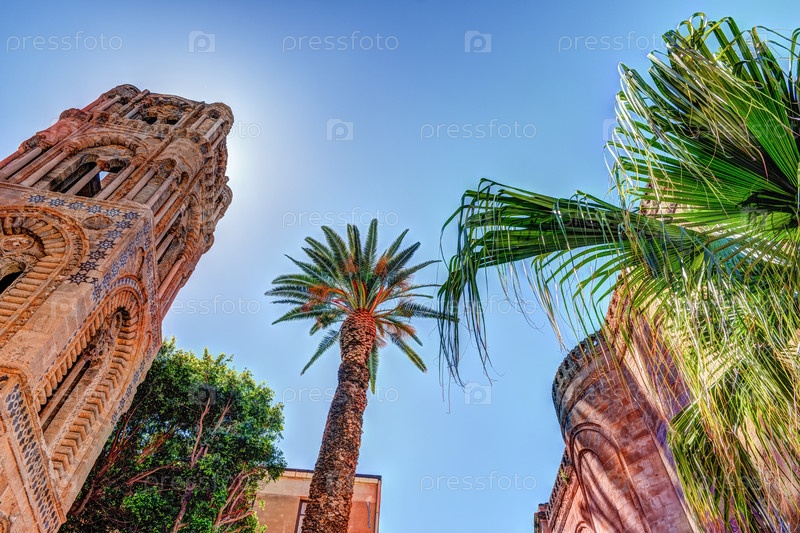 Колокольня церкви Марторана с пальмами, Палермо. Сицилия