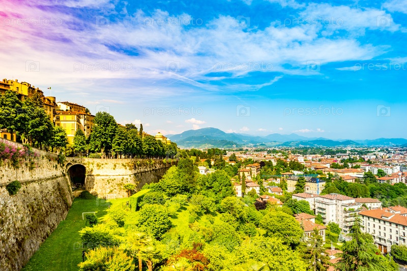 Панорамный вид Читта Альта, старый город. Бергамо