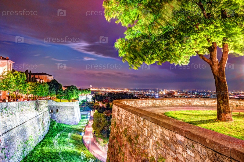 Каменные стены замка Ла Рокка в старом городе Бергамо