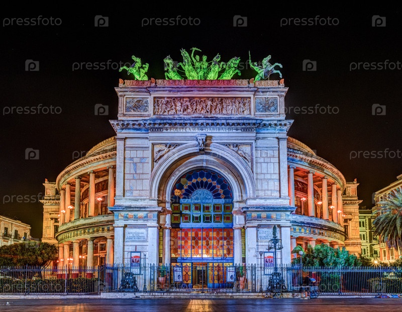 Ночной вид на театр Политеама Гарибальди в Палермо