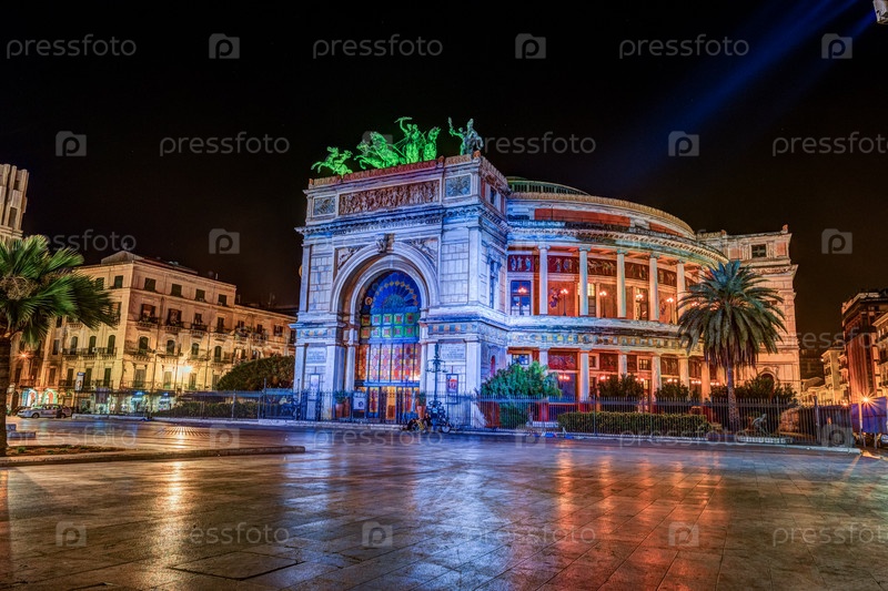 Ночной вид на театр Политеама Гарибальди в Палермо