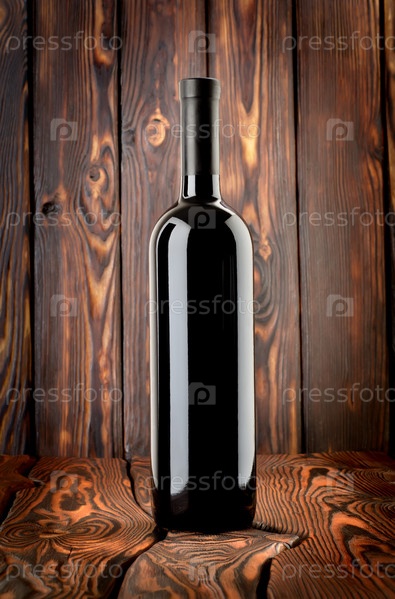 Бутылка красного вина на деревянном фоне