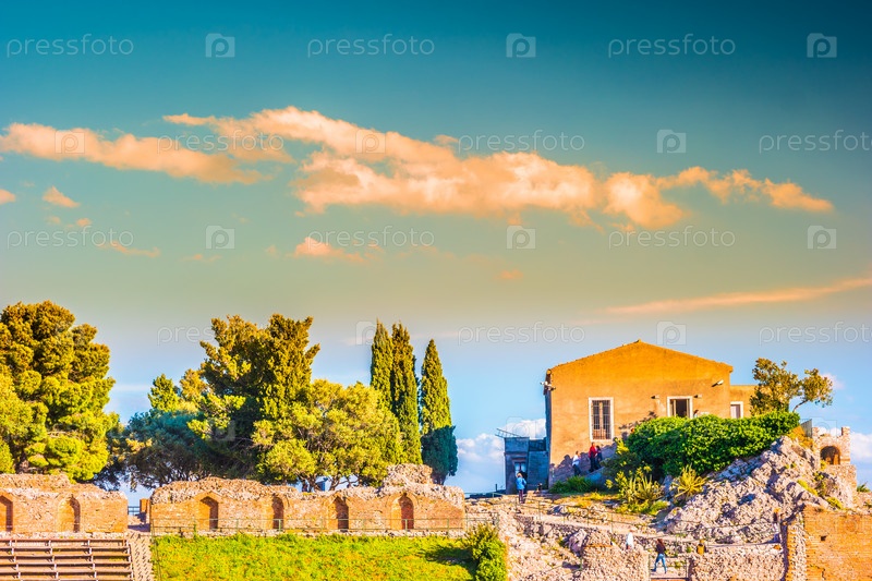 Руины Таормине театра на закате