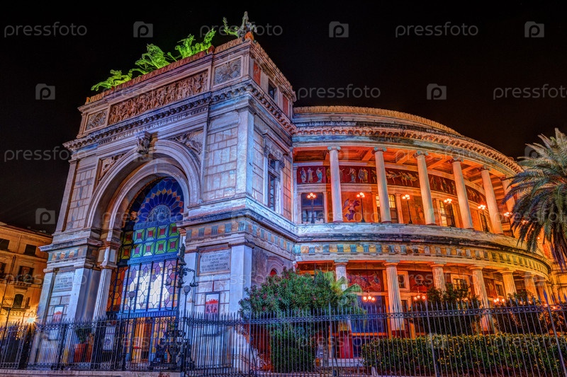 Ночной вид на театр Политеама Гарибальди в Палермо