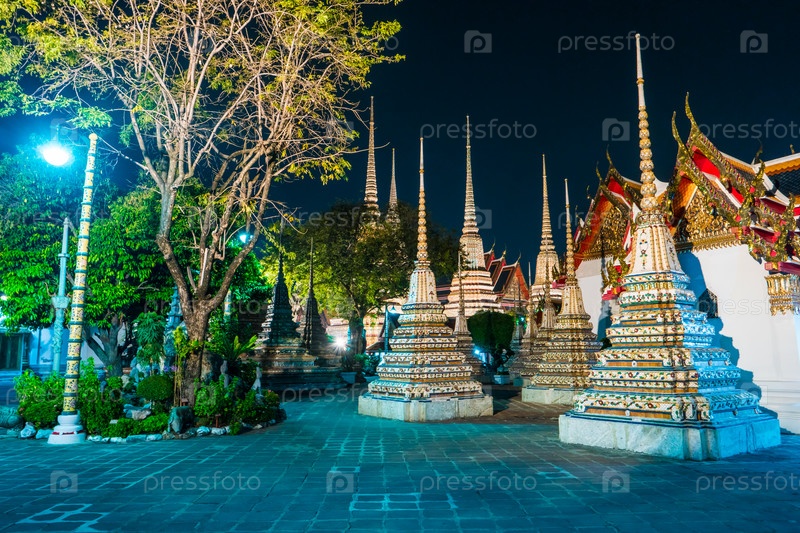 Красиво оформленные пагоды храма Ваты Пхи в ночное время