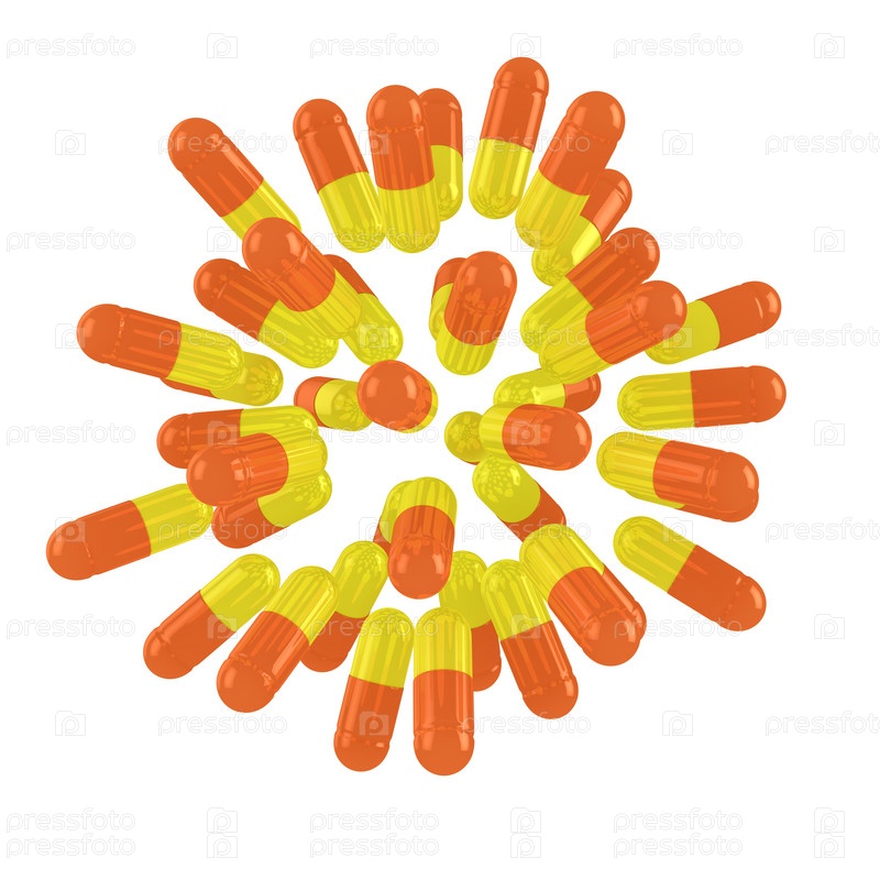 Взрыв из желто-оранжевых таблеток на белом фоне