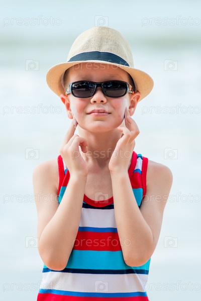 Мальчик на пляже в шляпе и очках