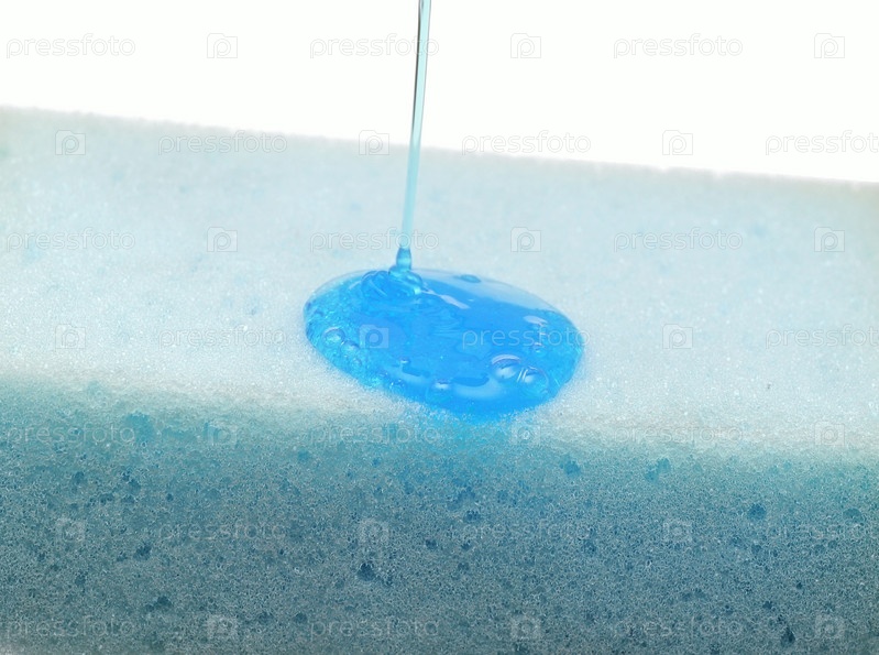 Губка и жидкое мыло, изолированные на белом фоне