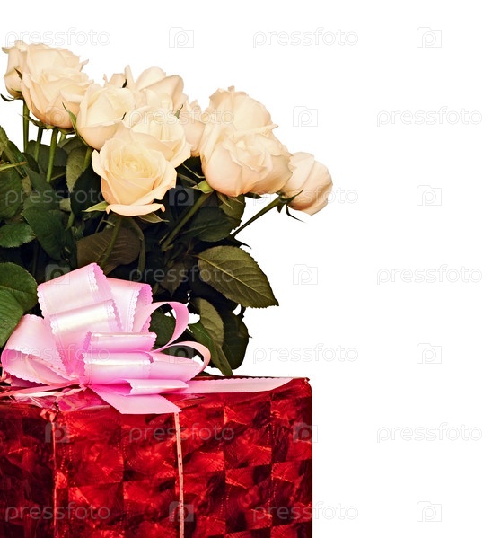 Прекрасные розы и подарок, изолированные на белом фоне