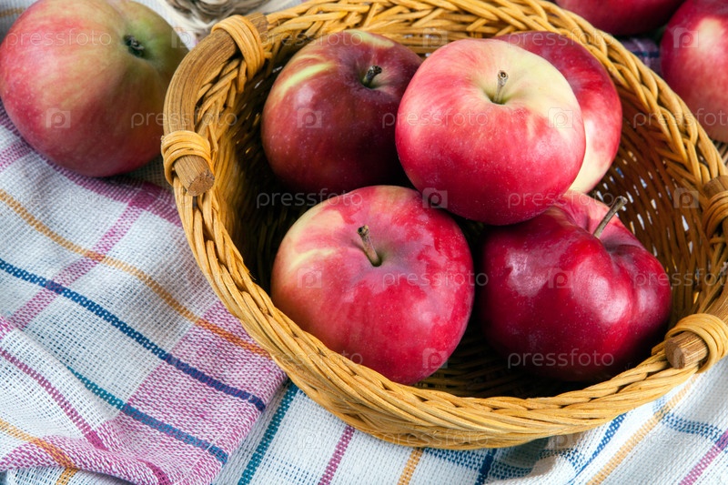 Куча яблок на салфетке в корзине