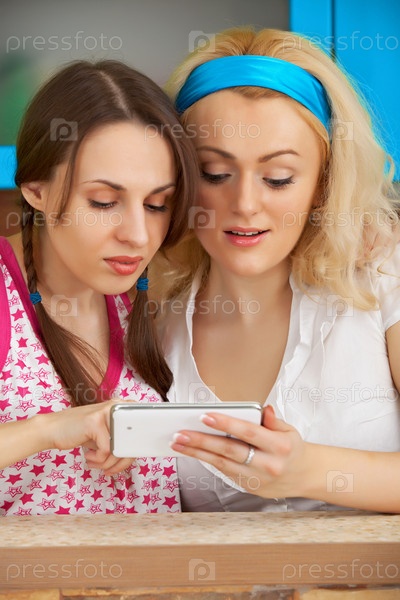 Женщины смотрят фотографии на мобильном телефоне