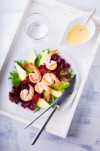 Салат из креветок с авокадо и горчичным соусом