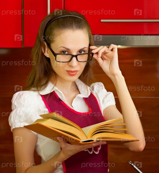 Женщина читает поваренную книгу на кухне