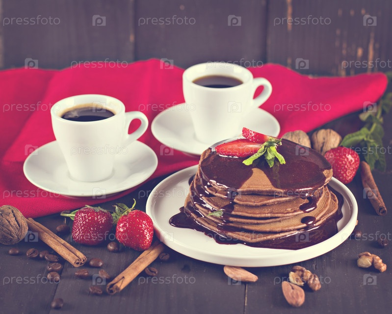 Завтрак. Две чашки кофе эспрессо и блины с клубникой