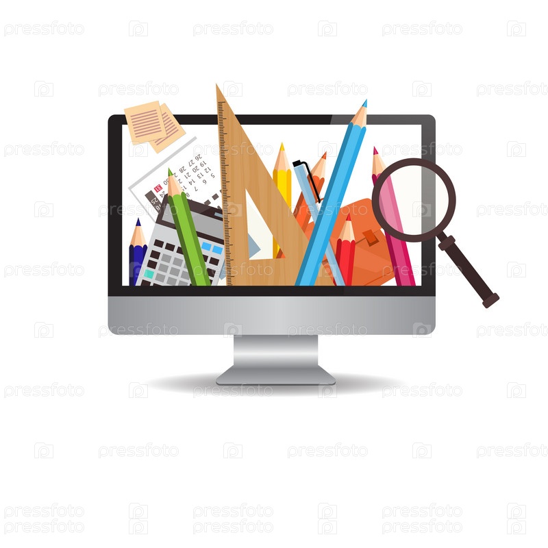 Монитор компьютера с изображением школьных принадлежностей на белом фоне