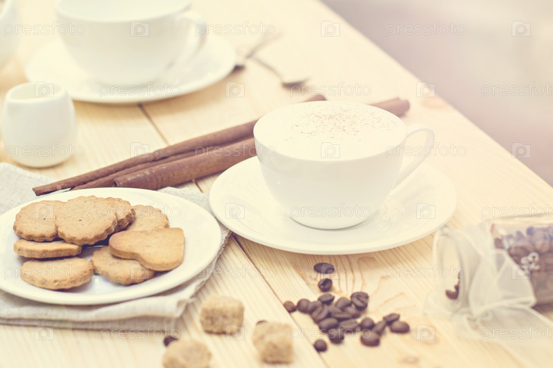 Имбирное печенье, корица, чашка горячего кофе