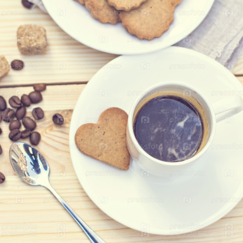 Имбирное печенье, корица, чашка горячего кофе