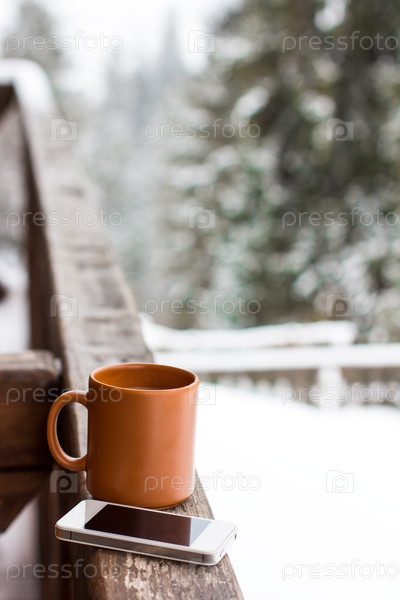 Чашка с горячим напитком и мобильным телефоном на фоне зимнего леса