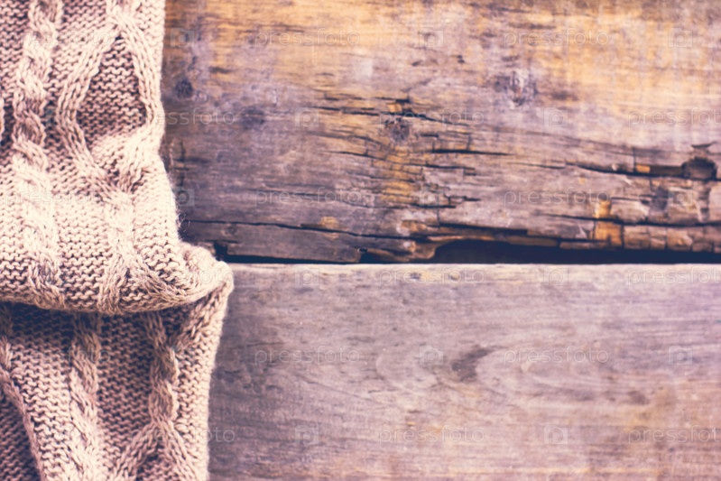 Вязаный плед или свитер на старых деревянных досках