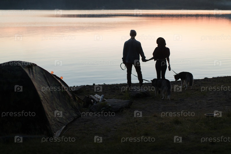 Пара с двумя собаками на пляже