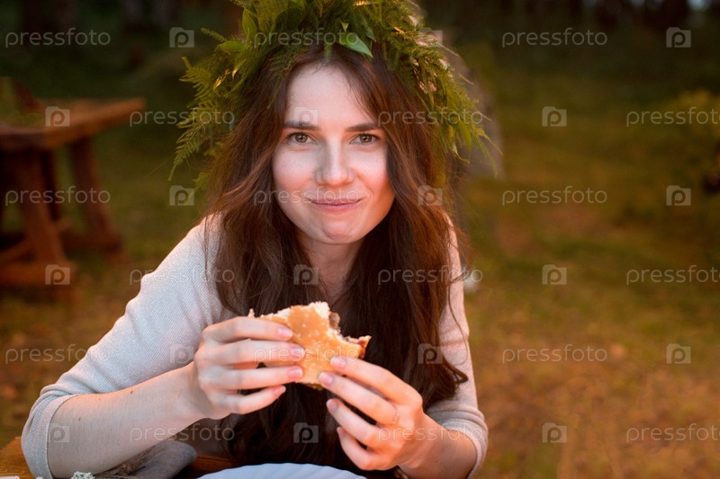Женщина ест гамбургер