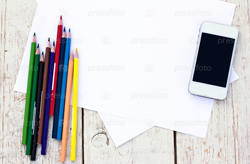 Цветные карандаши, мобильный телефон и бумаги на столе