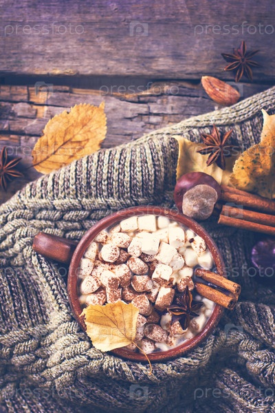 Горячий какао с зефиром со специями на старых деревянных досках