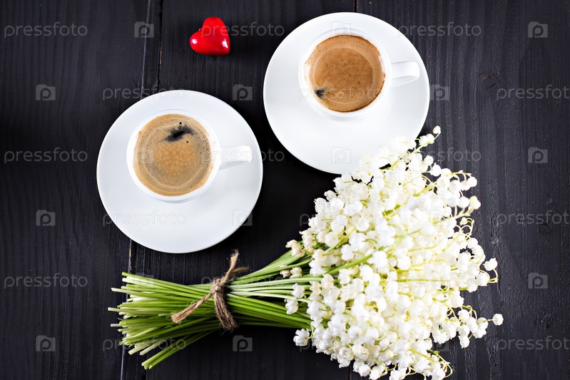Две чашки кофе - эспрессо, сердце и букет цветов