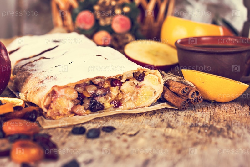 Яблочный штрудель с апельсинами, клюквой и сухофруктами