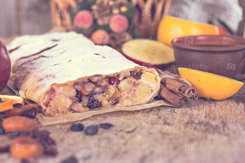 Яблочный штрудель с апельсинами, клюквой и сухофруктами