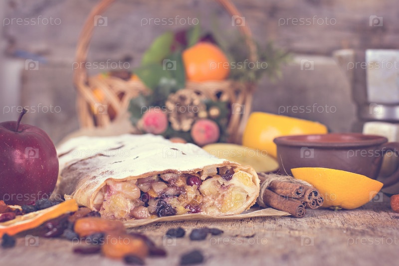 Яблочный штрудель с апельсинами, клюквой и сухофруктами