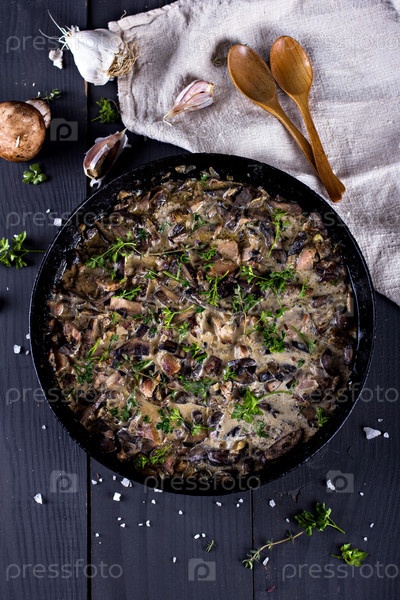 Жареные грибы с мясом, маслом, петрушкой и чесноком