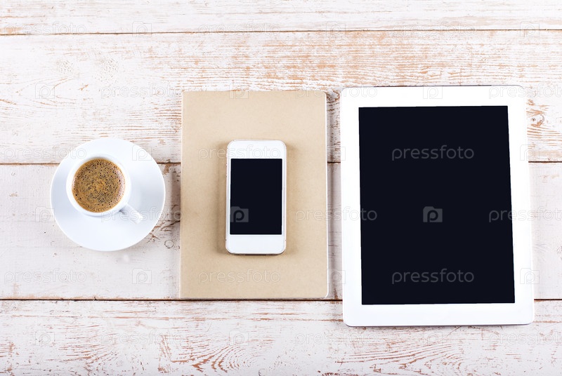 Планшетный компьютер, блокнот, мобильный телефон и чашка кофе