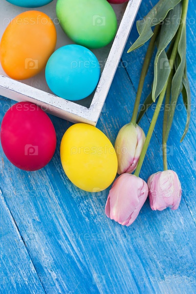 Пасхальная композиция. Пасхальные яйца и цветы на столе