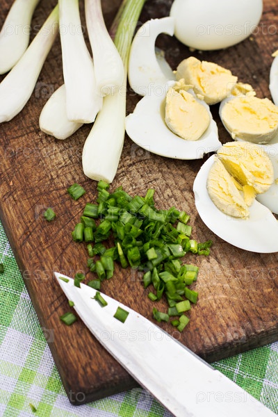 Яйца, зеленый лук и зелень на столе